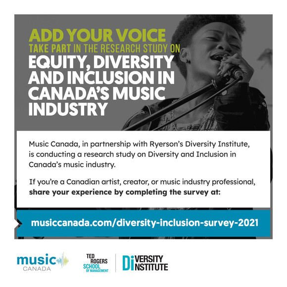 Music Canada, in collaboration with the Diversity Institute at Ryerson University’s Ted Rogers School of Management, has launched a survey as part of a new and first-of-its kind research study on equity, diversity and inclusion in Canada’s music industry. Artists, creators, and music industry professionals are encouraged to participate in the national and bilingual survey linked at https://musiccanada.com/diversity-inclusion-survey-2021.