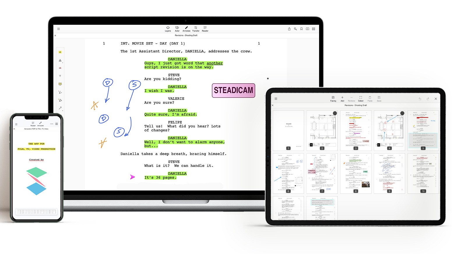 The idea of Scriptation came about when I was working on a pilot in 2013. We had this unusual production schedule where every night we were issuing a 50-page script revision to over 100 people. The next day, everyone would throw out the previous day’s scripts for the new ones, rewriting all their notes in the process. This just seemed like an enormous waste of time and paper, so we thought, “What if we could create a digital app that could transfer notes from one draft to the next?” That’s what sparked the initial idea of Scriptation.