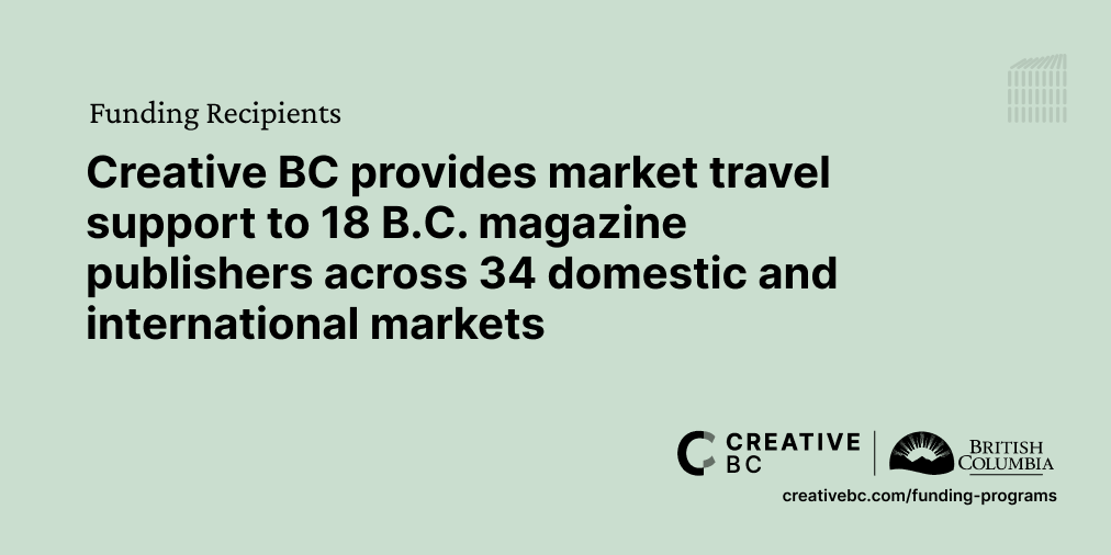 “Creative BC is proud to support these 18 B.C. magazine publishers in expanding their reach worldwide. The Magazine Travel Support program helps them access new markets and business opportunities, strengthening both their individual growth and the broader industry. While the magazine publishing industry faces its challenges, its continued growth is part of the fabric of B.C.’s creative economy, which contributed $117 million in total GDP in 2023.”